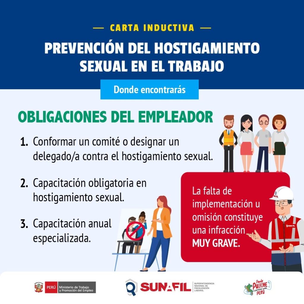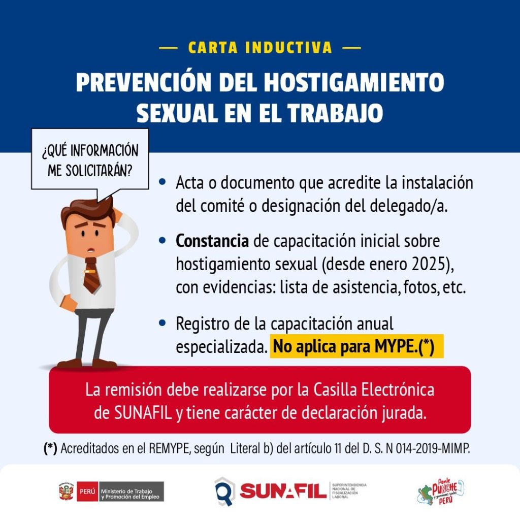 Más de 26,000 cartas inductivas enviadas a nivel nacional sobre hostigamiento sexual laboral. En un esfuerzo por reforzar la prevención del hostigamiento sexual laboral en el Perú, la SUNAFIL (Superintendencia Nacional de Fiscalización Laboral) ha enviado más de 26,000 cartas inductivas a empleadores de todo el país. Este importante paso busca promover ambientes laborales seguros, igualitarios y libres de violencia.